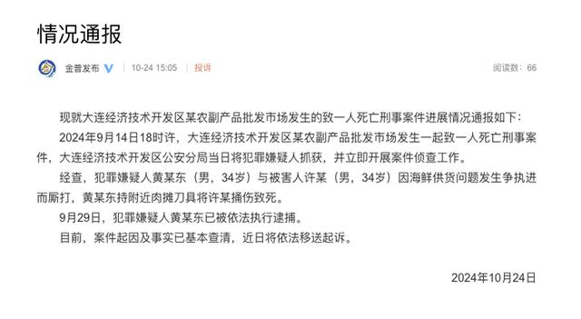 ·大连通报一男子在市场遇害:因海鲜供货问题,嫌疑人已被逮捕将移送起诉。