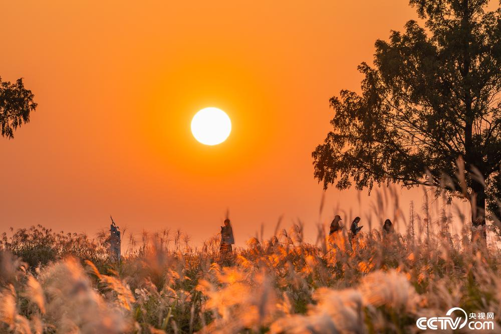 杭州良渚古城遗址公园内夕阳与芦苇映成了一幅画,在秋日里分外抢眼。