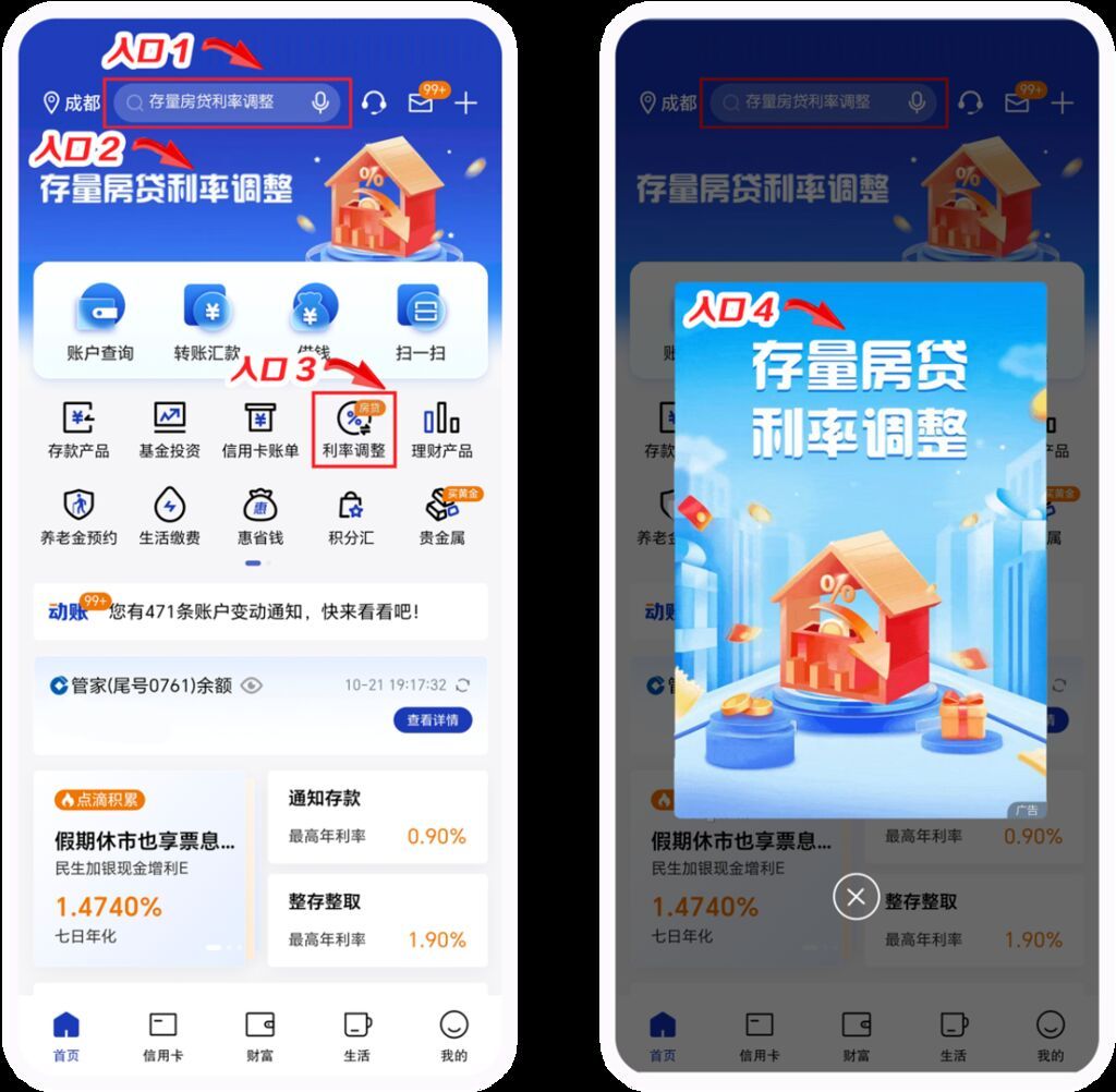 目前,多家银行已在手机App中设置存量房贷专属模块、滚动信息栏、广告弹窗、置顶窗口等查询入口,借款人也可通过搜索栏直接搜索“存量房贷利率调整”进行查询,部分银行可在微信公众号进行查询。此外,多家银行通过短信通知的形式告知借款人存量房贷利率调整结果。