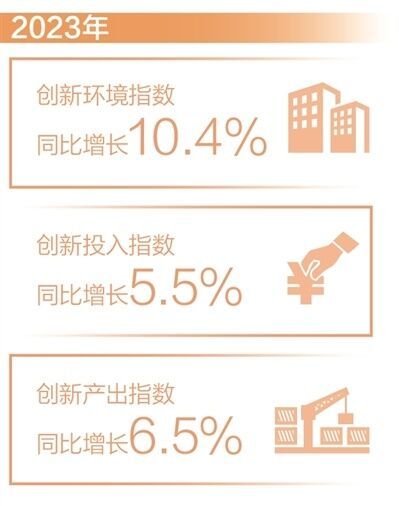 在创新环境领域,享受加计扣除减免税企业所占比重指数比上年增长24.0%;在创新投入领域,每万人R&D(研究与试验发展)人员全时当量指数比上年增长14.1%,继续保持两位数增长;在创新产出领域,每万名R&D人员高价值发明专利拥有量指数比上年增长15.6%;在创新成效领域,全员劳动生产率指数比上年增长5.7%。