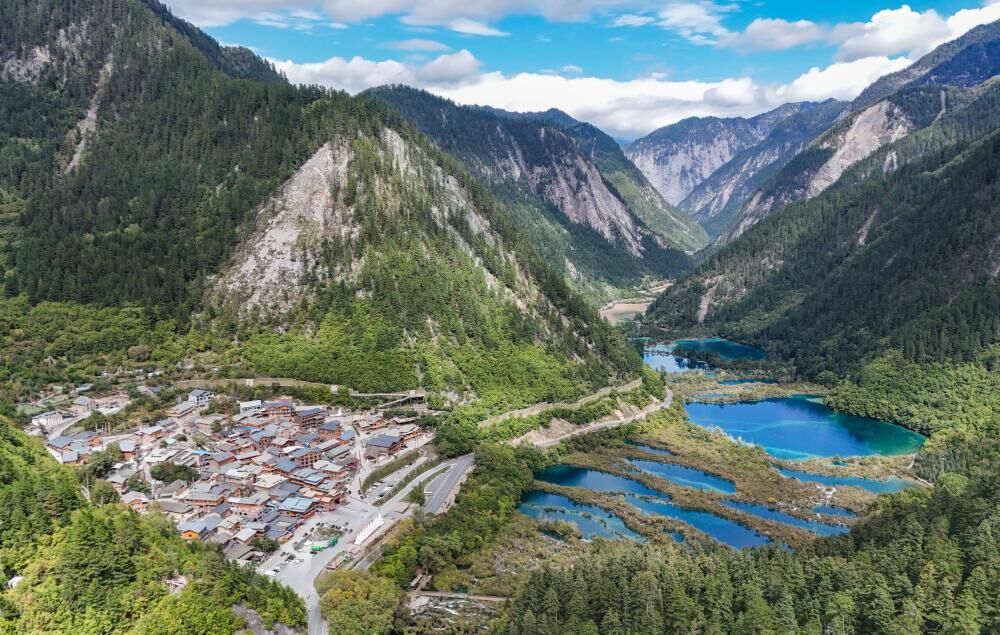 从高空中俯瞰,树正沟、日则沟和则查洼沟3条主沟呈不规则的“Y”字形躺卧于九寨沟起伏的峰峦之间。数以万计的游客散落在绵延40多公里的狭长沟谷内,却并不显得拥挤。