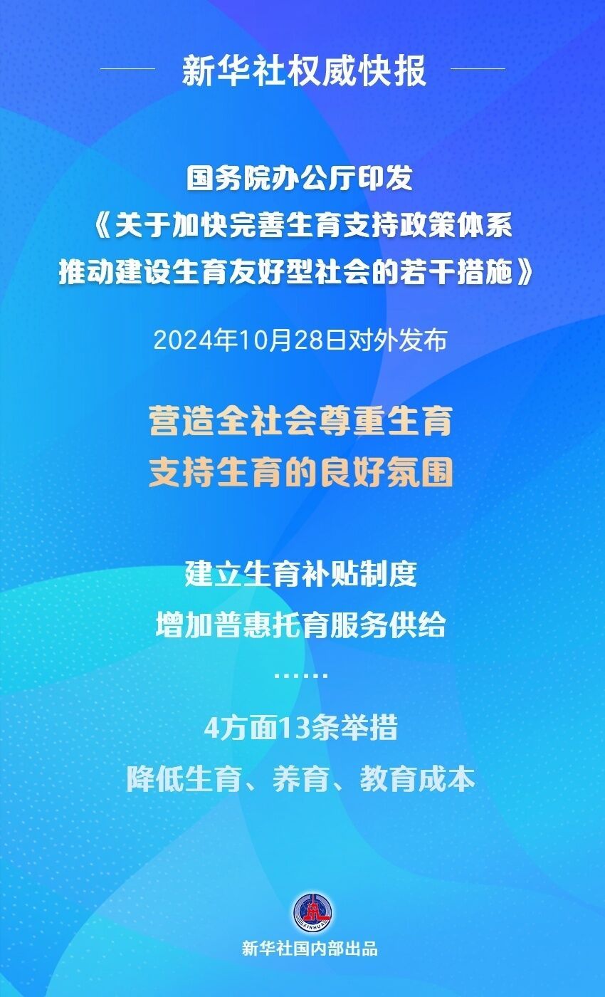 国务院办公厅印发的《关于加快完善生育支持政策体系推动建设生育友好型社会的若干措施》2024年10月28日对外发布。