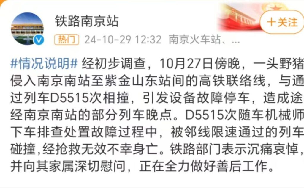 10月29日,铁路南京站发布情况说明:经初步调查,10月27日傍晚,一头野猪侵入南京南站至紫金山东站间的高铁联络线,与通过列车D5515次相撞,引发设备故障停车,造成途经南京南站的部分列车晚点。D5515次随车机械师下车排查处置故障过程中,被邻线限速通过的列车碰撞,经抢救无效不幸身亡。铁路部门表示沉痛哀悼,并向其家属深切慰问,正在全力做好善后工作。