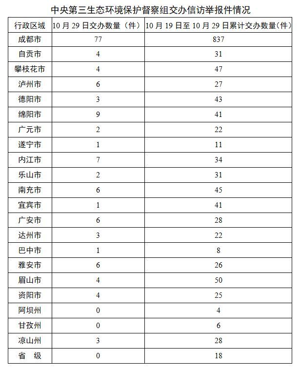 10月29日,中央第三生态环境保护督察组向四川移交第十一批群众信访举报件149件(来电举报89件,来信举报60件),其中重点关注11件。