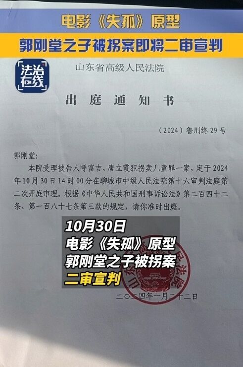 今天(10月30日)14时,备受关注的郭刚堂之子被拐案将在山东省聊城市中级人民法院二审二次开庭。本案合议庭由山东省高级人民法院组成,上诉人为原审两名被告人呼富吉、唐立霞,山东省人民检察院派员出庭,郭刚堂等被害人家属将到庭参加诉讼。
