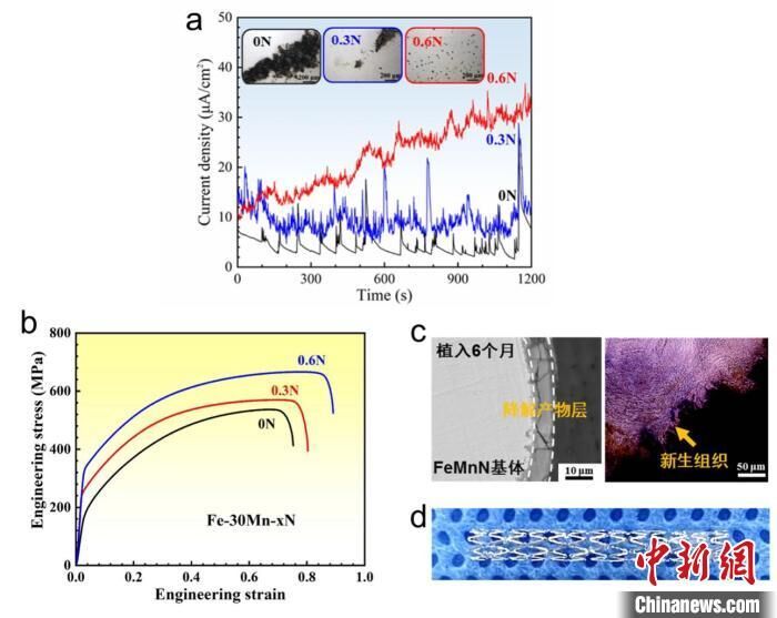 本项研究相关示意图:a.高氮铁合金的降解更加快速均匀;b.强韧性更高;c.生物相容性优异;d.目前已开发出可降解高氮铁合金血管支架。中国科学院金属所/供图