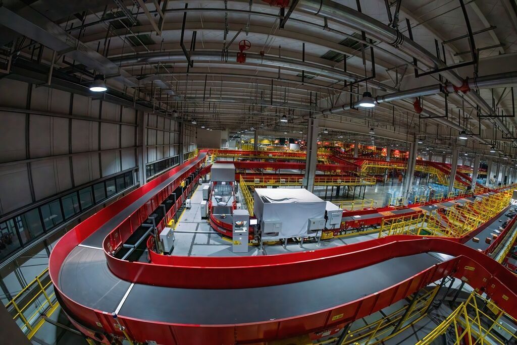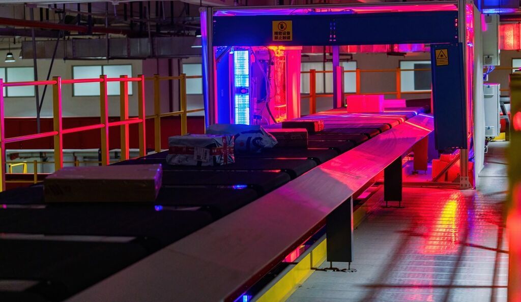 10月30日10点53分,顺丰长兴中转场大门口,二十余辆黑色涂装的货车依次从园区内驶出,开往不同网点送货。走进中转场内,想象中快递堆成山,人员跑断腿的场景并未出现,取而代之的是一条条环形的传送带以及不停闪光的“方盒子”。偌大的车间内只有几十名工作人员在进行卸货、拆包、装货工作,分拣工作全部交给智能设备来完成。