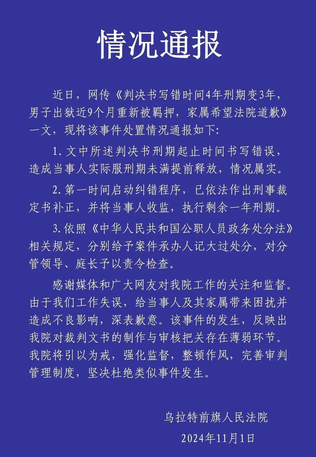11月1日,乌拉特前旗人民法院官微发布情况通报,内容如下: