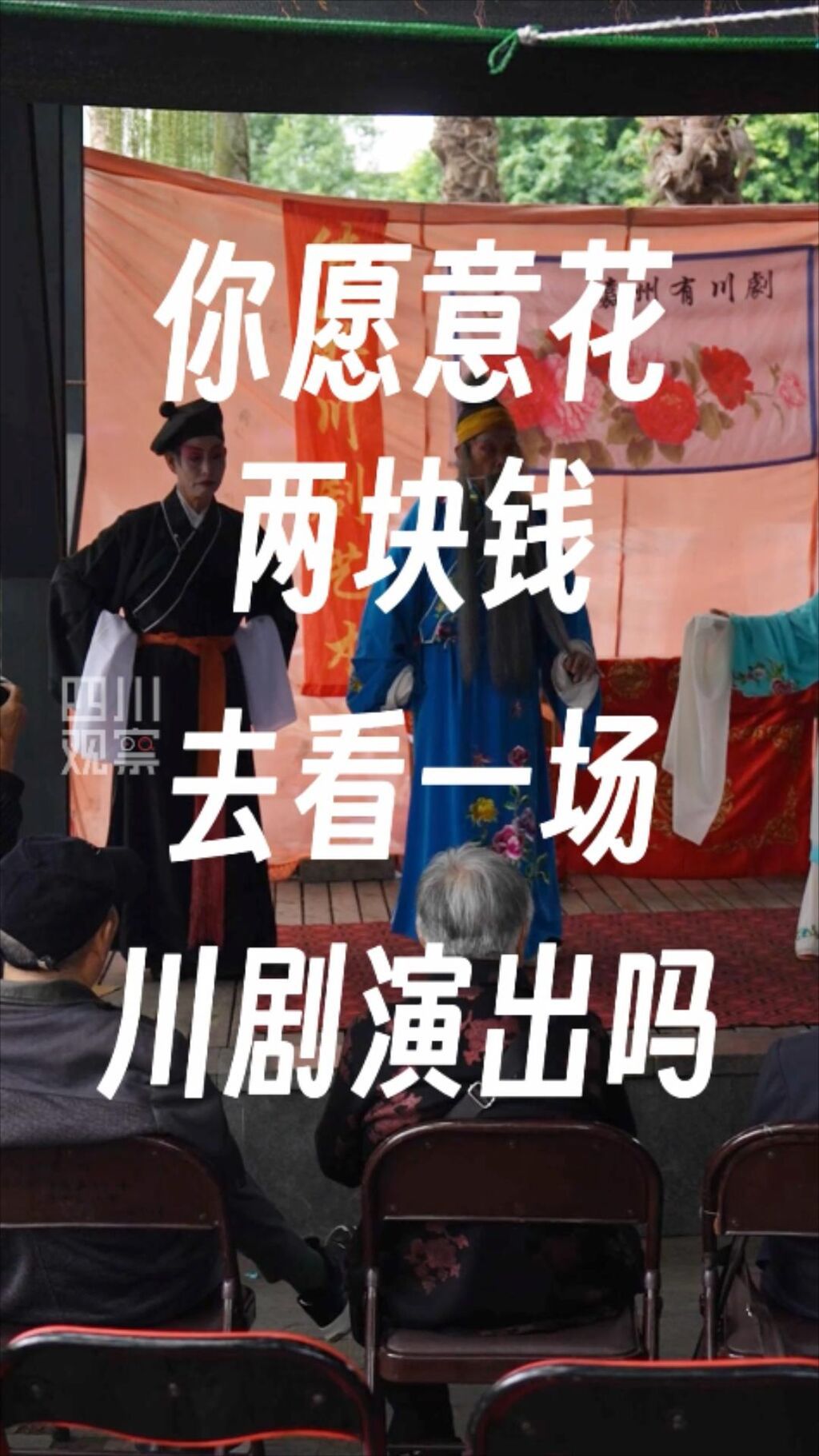你愿意花两块钱去看一场川剧演出吗?在乐山市市中区大曲口广场一角,记者见到了一个很接地气的川剧团——岷江川剧社。他们都是一群人均80岁以上,热爱戏曲的老年人。一个几尺见方的舞台,几张幕布,十几个板凳,就是他们的表演班子的全部。每周三的下午两点到四点,他们都在这里表演,一演就是四十年,台下的观众,也看了四十年。
