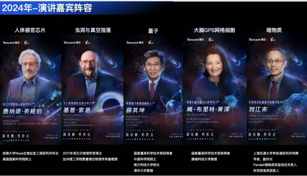 十二年来,腾讯科学WE大会致力于面向公众分享最具突破性的科学发现和前沿思想,累计为全球超过1.2亿人次带来沉浸式科学互动体验。宇宙学家霍金、数学物理学家彭罗斯等近百位全球顶尖科学家及科技工作者登上WE大会舞台,带来宇宙学、理论物理、生命科学等十多个领域的科学前沿突破。
