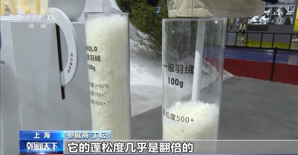参展商 丁耘:这个是我们采用的优质羽绒和一般的羽绒在同样100克的情况下,它的蓬松度几乎是翻倍的,这样才可以做到更加保暖。做个小测试模拟风力直击,在使用我们的防风面料之后,基本上是静止的状态。