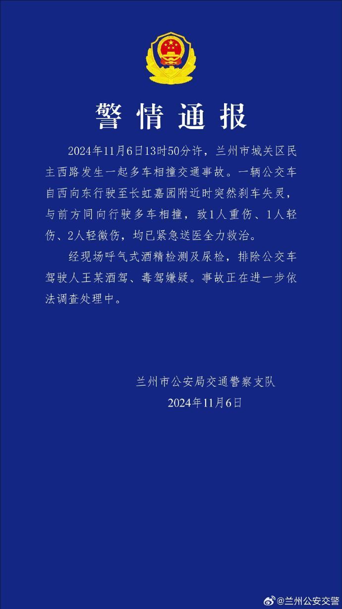 央视网消息:据@兰州公安交警 消息,11月6日13时50分许,兰州市城关区民主西路发生一起多车相撞交通事故。一辆公交车自西向东行驶至长虹嘉园附近时突然刹车失灵,与前方同向行驶多车相撞,致1人重伤、1人轻伤、2人轻微伤,均已紧急送医全力救治。经现场呼气式酒精检测及尿检,排除公交车驾驶人王某酒驾、毒驾嫌疑。事故正在进一步依法调查处理中。