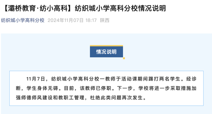 ·西安一小学教师活动课期间踢打两名学生,校方:已停职。