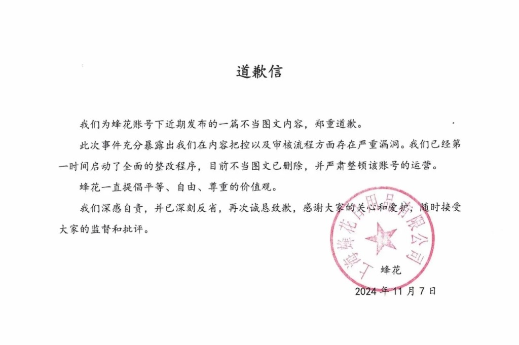 ·蜂花就“真假闺蜜”图文致歉:删除不当内容,整顿账号运营。