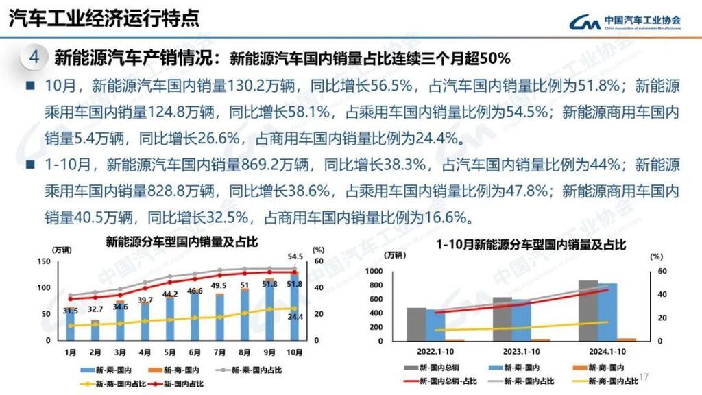 中汽协发布数据显示,10月,新能源汽车产销分别完成146.3万辆和143万辆,同比分别增长48%和49.6%,新能源汽车新车销量占汽车新车总销量的46.8%。1—10月,新能源汽车产销分别完成977.9万辆和975万辆,同比分别增长33%和33.9%,新能源汽车新车销量达到汽车新车总销量的39.6%。