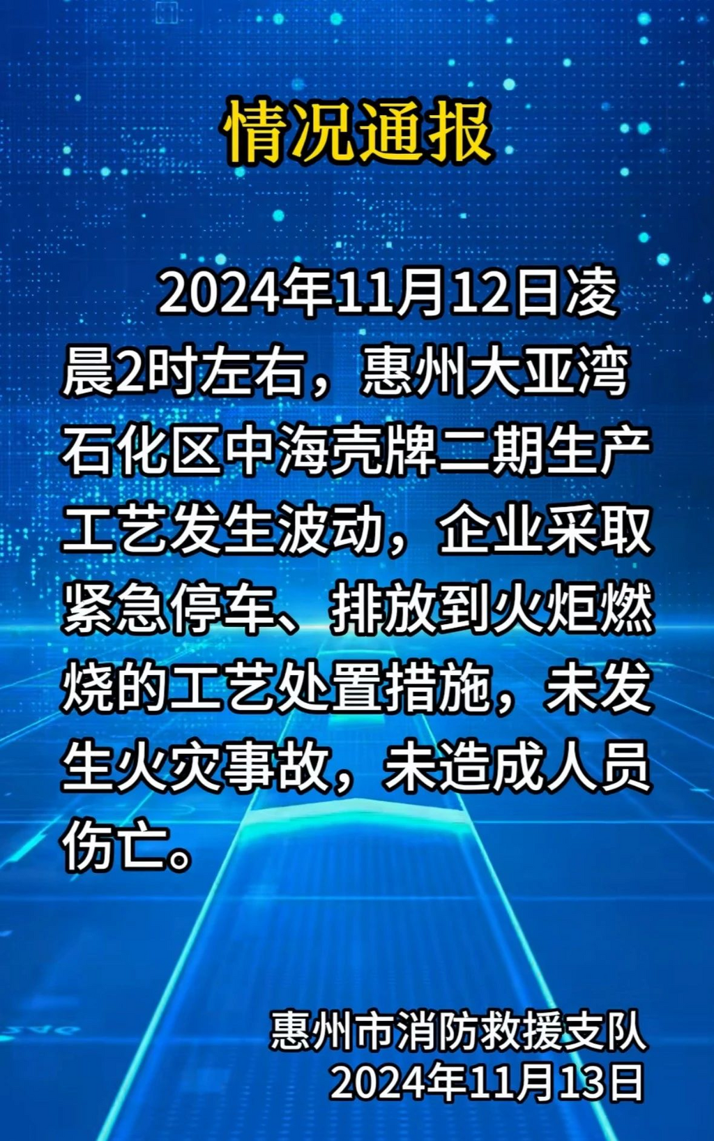 ·惠州大亚湾凌晨火光冲天?惠州消防通报:未发生火灾事故。