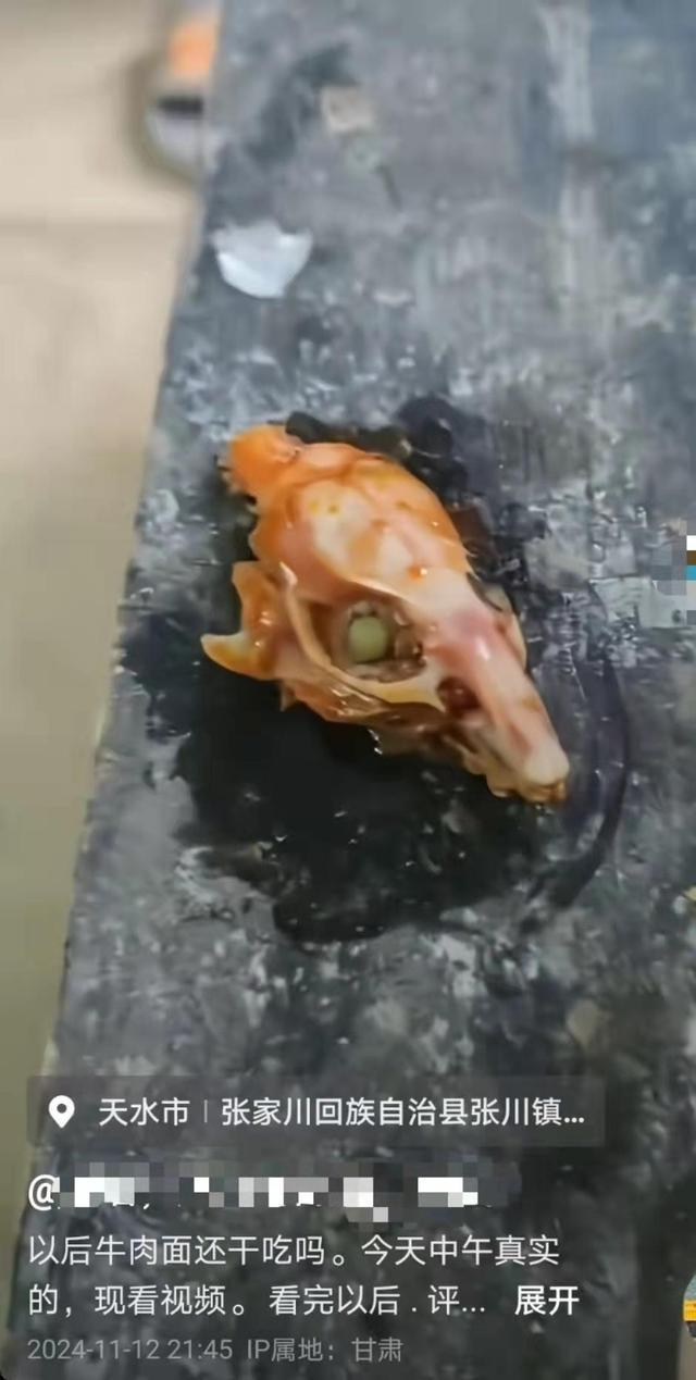 ·牛肉面里吃出老鼠头?甘肃天水张家川县通报:鸡头骨,系摆拍。