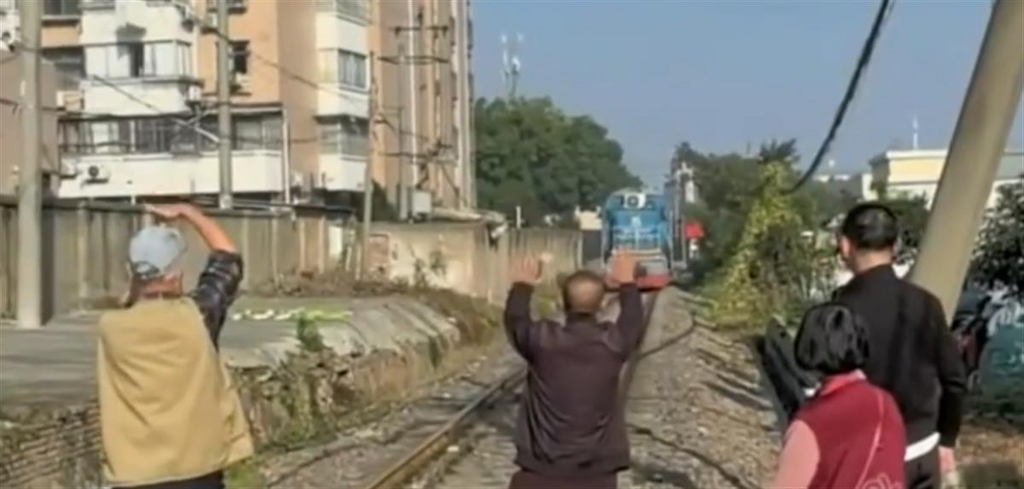 ·马鞍山一铁路旁有线杆倾倒,多位热心市民挥手拦停火车。