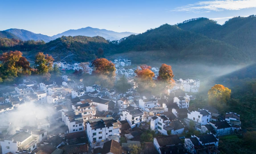 在江西上饶婺源县石城景区,徽派建筑群和五彩树木在晨雾中若隐若现,美景如画。