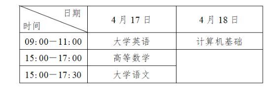 我省2025年普通高校专升本考试于2025年4月17日、18日统一组织进行。各科目考试时间(北京时间)安排如下表: