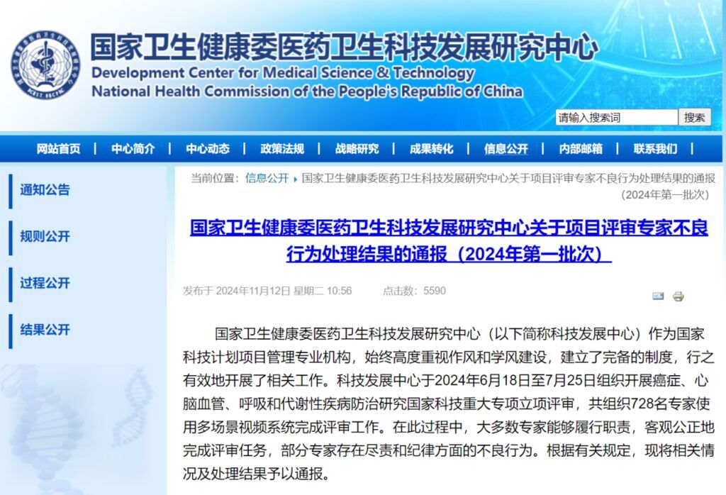 11月12日,国家卫生健康委医药卫生科技发展研究中心官网,发布关于项目评审专家不良行为处理结果的通报。