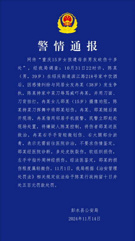 ·重庆15岁女孩遭母亲男友挥刀割伤多处,嫌疑人被行政拘留10日。