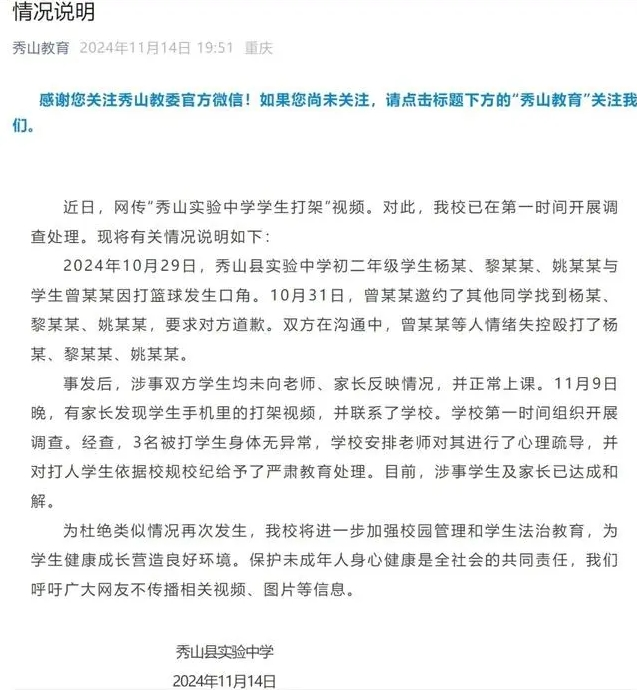 ·重庆秀山3名学生在公厕遭多人围殴?校方通报:严肃教育处理。