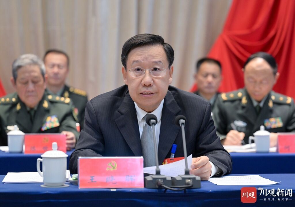 王晓晖指出,要坚定不移举旗铸魂,在淬炼绝对忠诚上树立更高标准。深化党的创新理论武装,全面深入贯彻军委主席负责制,以整风精神推进政治整训,引导广大官兵民兵自觉做“两个确立”的坚决拥护者和“两个维护”的坚定践行者。要聚焦抓好主责主业,在推进备战打仗上锻造更强能力。持续深化应战应急各项准备,大抓实战化军事训练,加强后备力量建设,扎实抓好全民国防教育,不断增强全民国防观念和爱军拥军参军热情。要主动服务地方发展,在助推四川现代化建设上展现更大作为。扛起服务国家战略腹地建设的时代使命,扎实抓好科技协同创新,加强新域新质力量建设,协调驻川部队支持地方做好经济建设、维稳处突、应急救援等工作。要始终坚持党管武装,在全面从严治党治军上取得更大成效。大力抓好党委班子建设,深入推进人才队伍建设,持续深化纪律作风建设,不断把全面从严治党、全面从严治军向纵深推进,用铁的纪律来凝聚铁的意志、锤炼铁的作风、锻造铁的队伍。