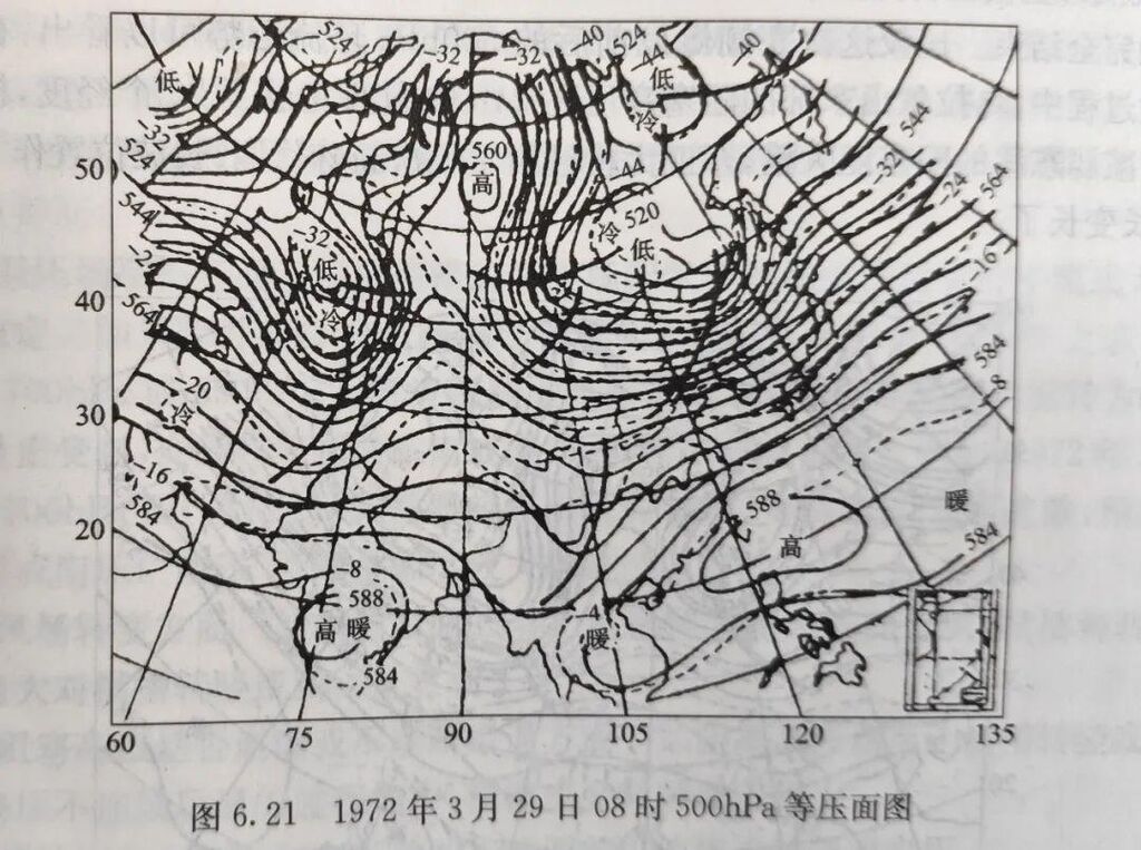 通常强冷空气和寒潮出现的前后,中高纬度往往会出现大的槽脊,也就是等高线有明显的南北走向。这样地面冷空气,不能通畅地向东走,如同在河流中建了个大坝,把水蓄积起来,等环流调整,大坝开闸放水,冷空气就会倾泻而下,形成寒潮天气(下图为《天气学原理和方法》中给出的经典寒潮形势)。