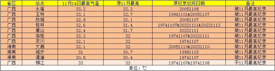 11月14日云南、贵州、广西、湖南、广东、海南、福建、江西部分地区最高气温超过30℃,仿佛还是盛夏的景象。广西、海南、湖南有10个国家级气象站打破了当地11月最高气温纪录,比如广西桂林最高气温32.6℃。