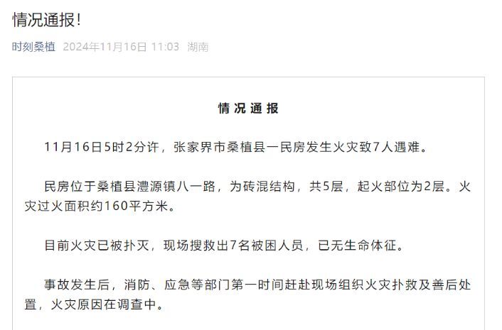 11月16日5时2分许,张家界市桑植县一民房发生火灾致7人遇难。