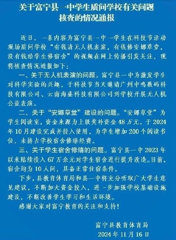 近日,一条内容为云南富宁县一中一学生在科技节活动现场质问学校“有钱请无人机表演,有钱修安娜草堂,没有钱给学生修宿舍”的视频在网上传播引发关注。今天(16日),富宁县教育体育局发布通报: