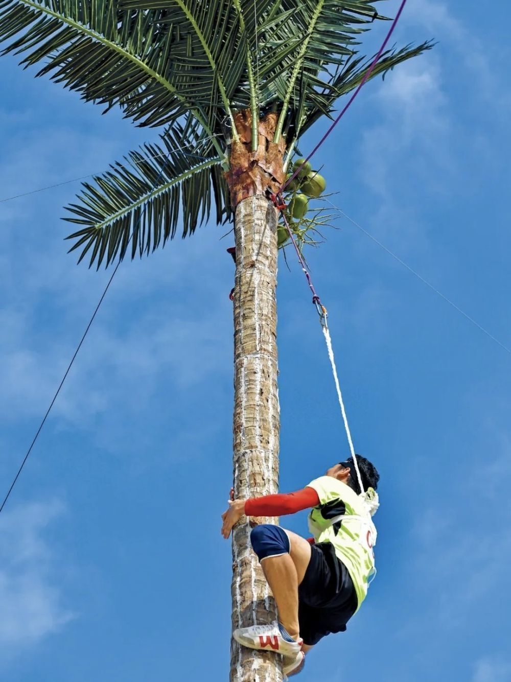 如果你对巴黎奥运会上用时最短的项目——速度攀岩意犹未尽,在本届运动会上,可以关注速度攀岩“海南版”——攀椰竞速。