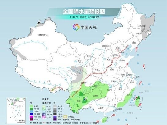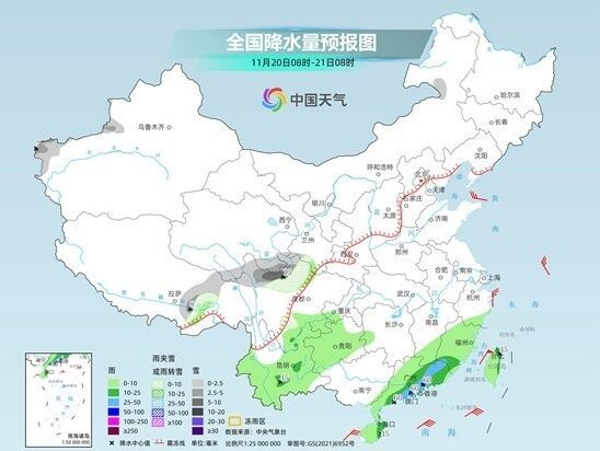 今明天(11月20日至21日),华南仍有明显降雨,局地有暴雨,同时西南地区降水频繁,需注意防范。气温方面,中东部大部地区未来三天以升温为主,内蒙古、东北地区等地明后天有小幅降温。