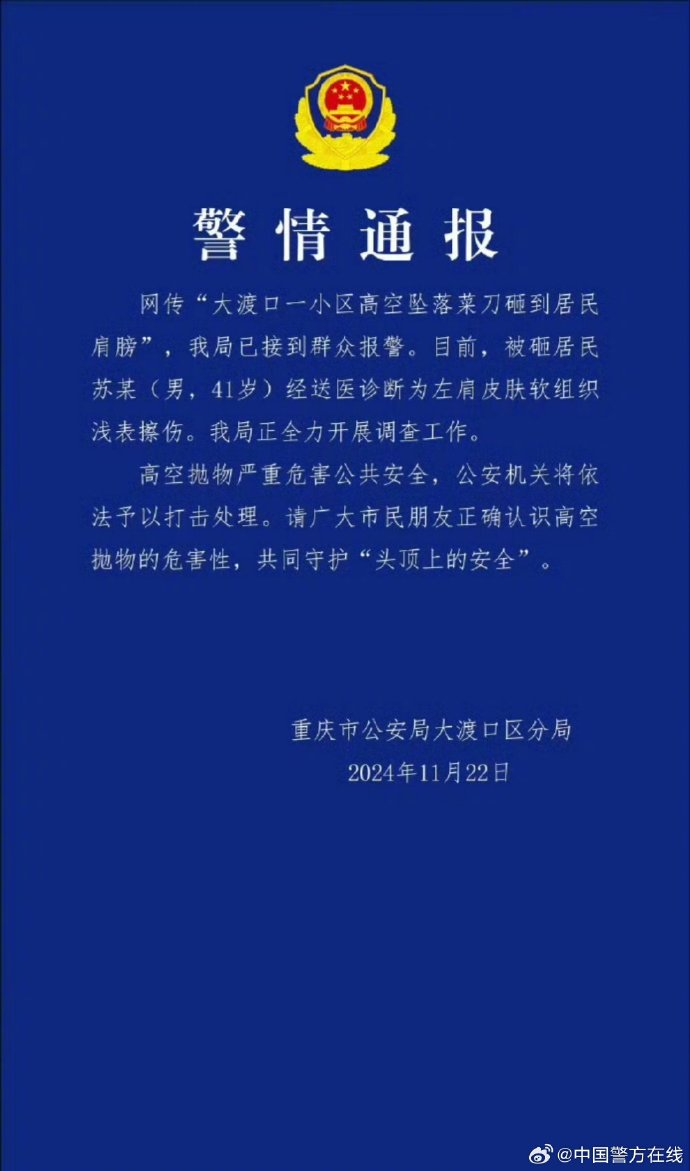 ·高空抛下的菜刀砸伤小区居民,重庆警方:正全力调查。