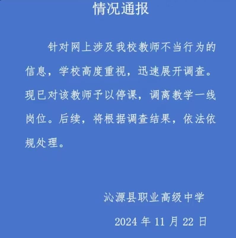 ·山西沁源一中学教师被指出轨学生,校方通报:停课,调离。
