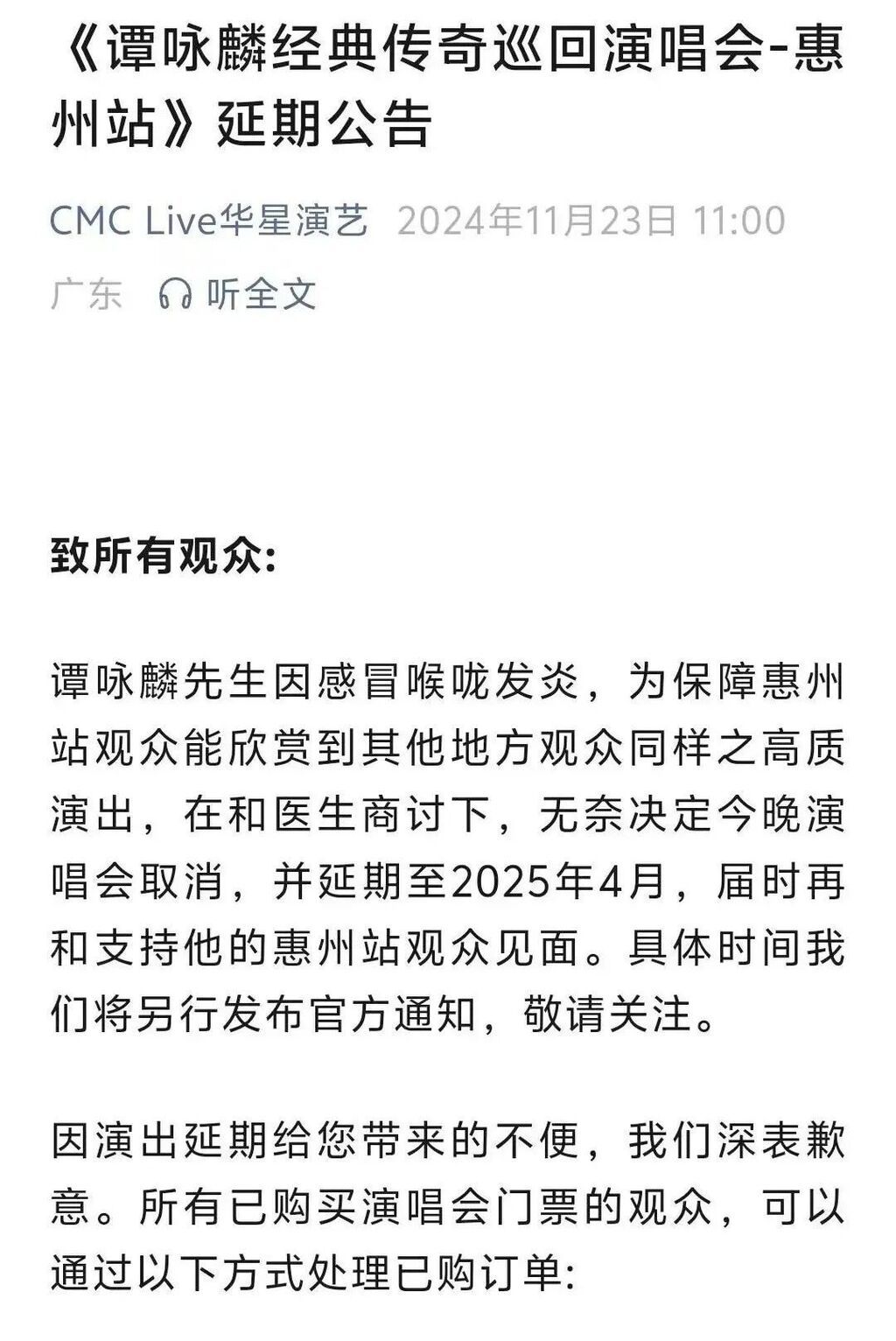 据了解,谭咏麟经典传奇巡回演唱会惠州站原定于11月23日19:30在惠州奥林匹克体育场举行。延期公告称,谭咏麟因感冒喉咙发炎,为保障惠州站观众能欣赏到其他地方观众同样之高质演出,在和医生商讨下,无奈决定11月23日演唱会取消,并延期至2025年4月。