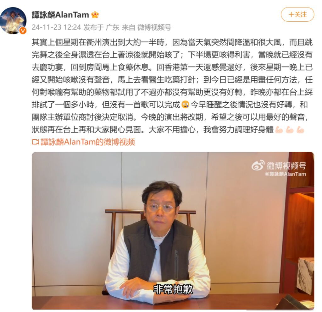 23日中午,谭咏麟在微博发视频表示:“上个星期在衢州演出到大约一半时,因为当天气突然间降温和很大风,而且跳完舞之后全身湿透在台上着凉后就开始咳了;下半场更咳得厉害,当晚就已经没有去庆功宴,回到房间马上食药休息。回香港第一天还感觉还好,后来星期一晚上已经又开始咳嗽没有声音,马上去看医生吃药打针;到今日已经是用尽任何方法,任何对喉咙有帮助的药物都试用了不过亦都没有帮助更没有好转,昨晚亦都在台上彩排试了一个多小时,但没有一首歌可以完成。今早睡醒之后情况也没有好转,和团队主办单位商讨后决定取消。今晚的演出将改期,希望之后可以用最好的声音,状态再在台上再和大家开心见面。大家不用担心,我会努力调理好身体。”