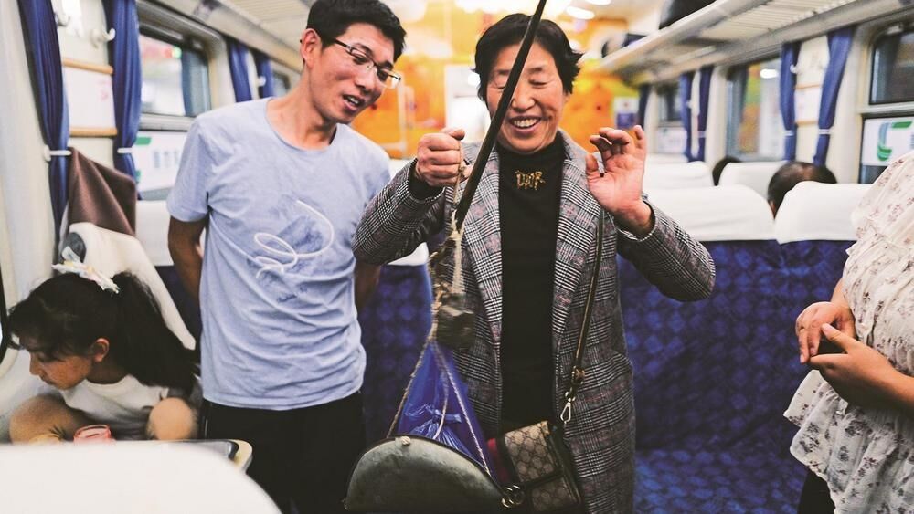 如果赶上了,车厢里就能做买卖。这不,冯大叔就十分欣喜,他从山上背下来的野板栗刚上车就开张了。乘务员宋大姐向乘客力荐:“山里的板栗,香得很咧!”
