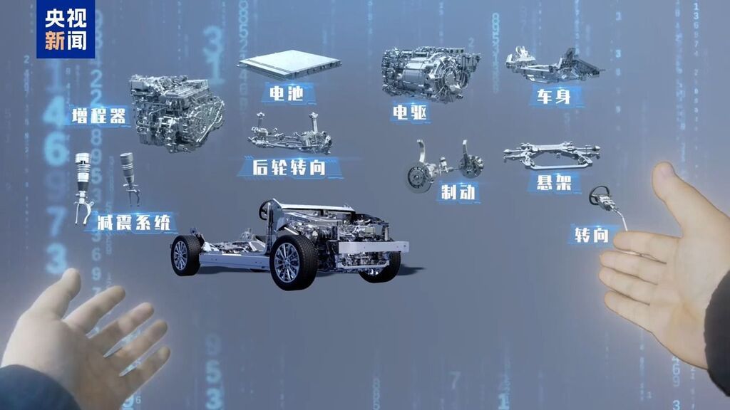 像这辆新能源汽车,光大件就有车身、电池、电驱等等。再细拆,能拆出上千个整体模块,超过1万个零部件。
