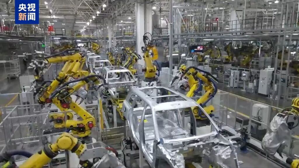 总台央视记者 李厦:流程多长?我带你看看去!这里就是一座新能源车的超级工厂,看,这里配备了超过1600台智能终端和3000多台机器人,它们智能协同工作,关键生产工序实现了100%自动化。这个繁忙的产线,几分钟就能有一台新能源车下线。