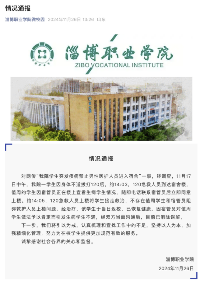 ·120男医护进女生宿舍楼遇阻?山东淄博职业学院通报。
