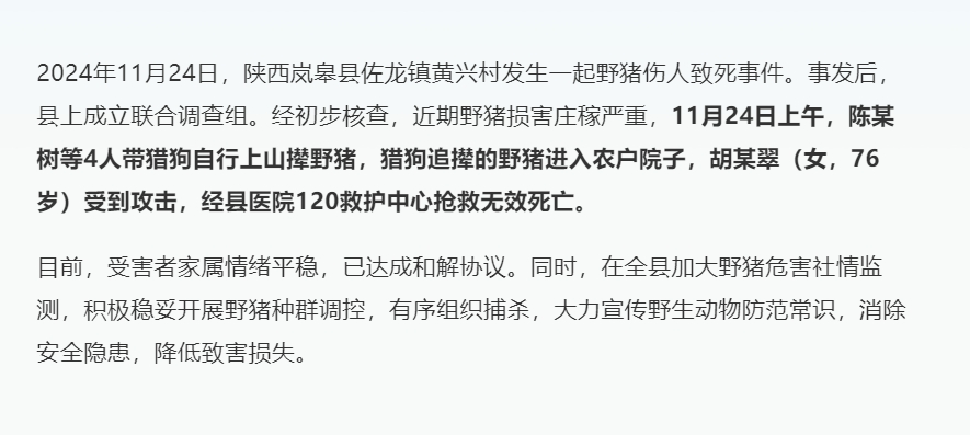 ·陕西岚皋发布野猪伤人致死情况说明:猎狗将野猪追进农户院子。
