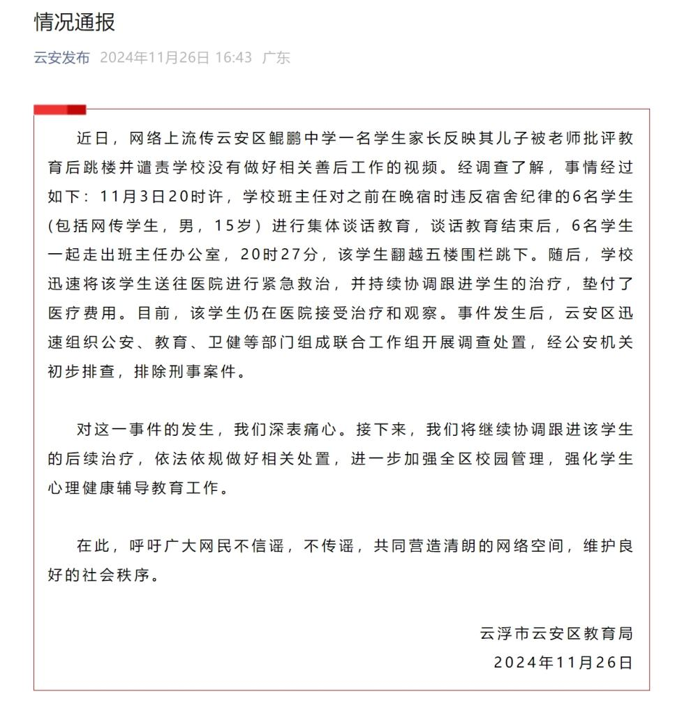 ·网传广东云浮一中学生被批评教育后跳楼,当地教育局通报事发详情。