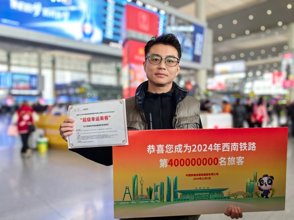 12月3日上午10点过,成都东站候车大厅比平时更加热闹。在人群的簇拥下,旅客何平走上舞台,接过铁路部门为他准备的精美礼品。因为,他就是当天的“幸运儿”——中国铁路成都局集团有限公司今年第4亿名旅客。