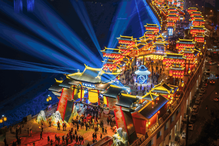 各大景区“花活儿”满满,广安不夜城以科技加持,创新“印象派大型实景情景剧场”,形成“文旅+商旅”的4.0模式;沿口古镇上千架无人机在嘉陵江上空以光影为笔、夜空为幕,描绘出巴国渔猎、汉初遗韵、武胜船歌、飞龙在天等梦幻图景;华蓥山旅游区邀请游客坐直升机赏雪、看网红大熊猫;前锋区欢喜坪旅游度假区推出云端滑雪、高山荡秋千、云顶大风车……