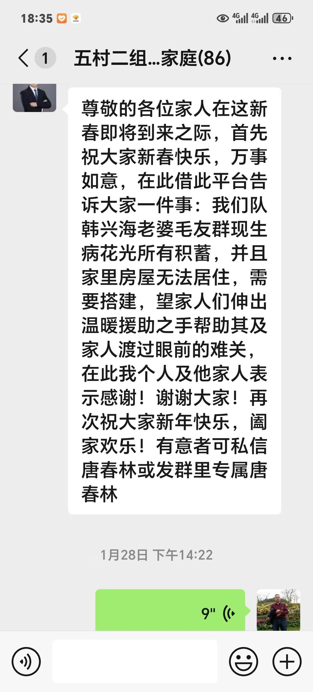 据了解,韩大爷和妻子常年在外打工,再加上经济困难,老家房屋已经荒废多年。2024年4月,妻子不幸查出宫颈癌晚期,家里积蓄基本掏空,无奈只得于春节前接回老家医治。但破旧房屋无法居住,一家人陷入困境。村民陈达然和唐春林了解情况后,在村里微信群发出暖心信息,村民们迅速响应,有钱出钱、有力出力。