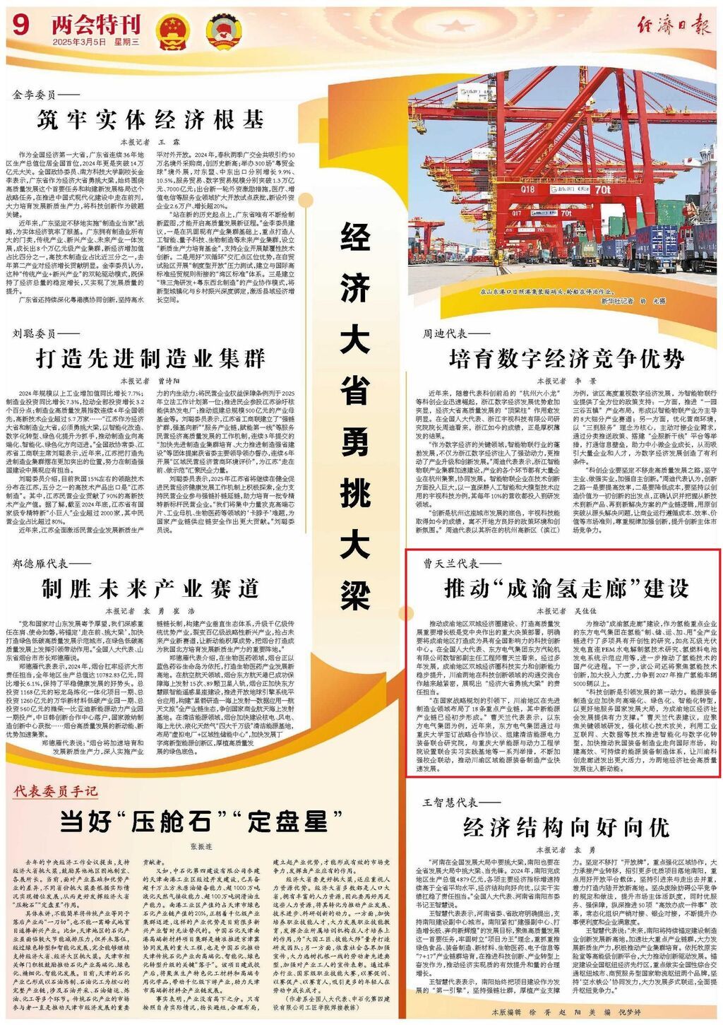 推动成渝地区双城经济圈建设、打造高质量发展重要增长极是党中央作出的重大决策部署,明确要将成渝地区打造成为具有全国影响力的科技创新中心。在全国人大代表、东方电气集团东方汽轮机有限公司数智部副主任工程师曹天兰看来,经过多年发展,成渝地区双城经济圈科技实力和创新能力稳步提升,川渝两地在科技创新领域的沟通交流合作越来越紧密,展现出“经济大省勇挑大梁”的责任担当。