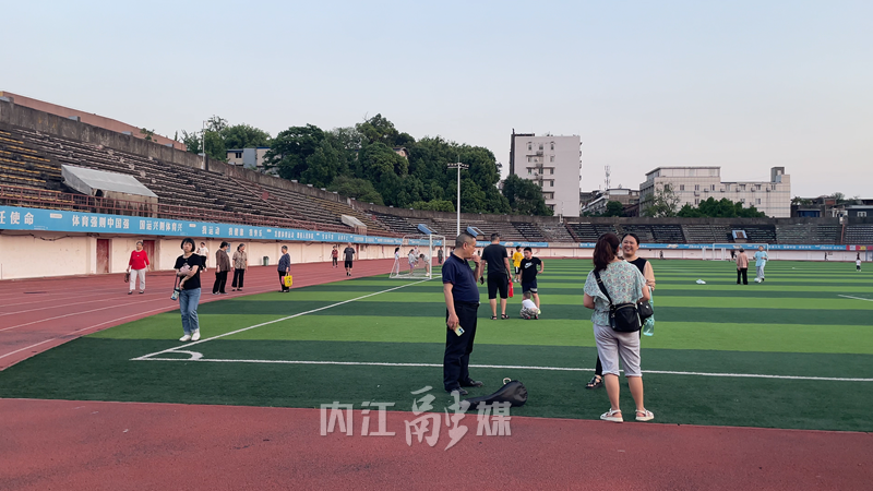 此外,在不远处的草坪上,还有不少家长带着孩子踢足球,孩童追逐着滚动的足球嬉笑奔跑;一旁的空地上,阿姨们随着音乐跳起广场舞,轻盈的步伐踏出假日的活力;跑道上,有人慢跑锻炼,有人结伴悠闲散步,晚风裹挟着此起彼伏的谈笑声,为假期夜晚增添了满满的“烟火气”。