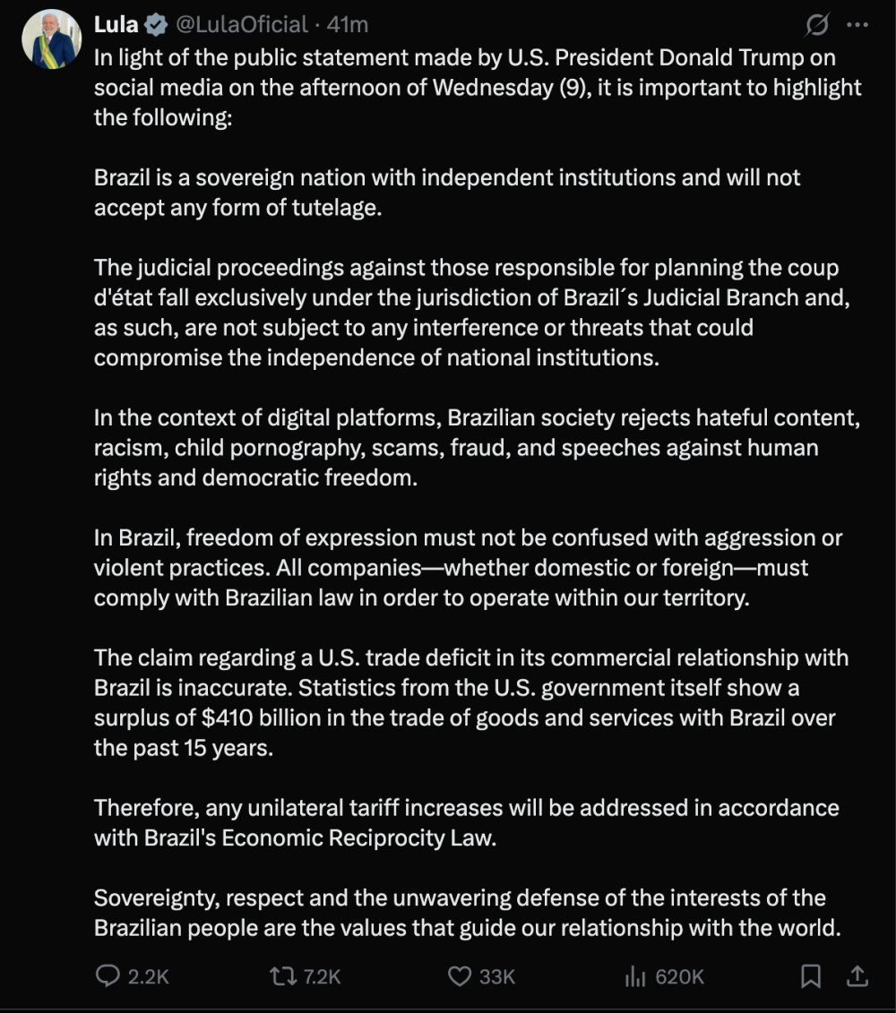 卢拉在社交媒体平台上发文写道,巴西将根据本国“经济对等法应对任何单方面的关税增加”。他说,主权和尊重与捍卫巴西人民利益等理念,指引其处理同外部国家的关系。
